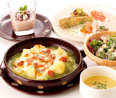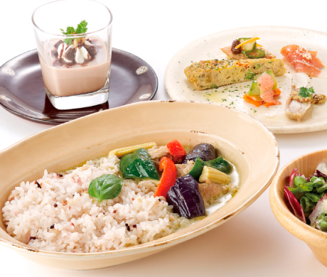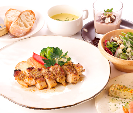+ 前菜盛り合わせ ・ サラダ ・ スープ ・ 季節のデザート パン or 白米 or 十五穀米 (3種類の中からおえらびください。) |